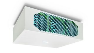 Conçue pour être installée sur des plafonds suspendus, et pour permettre la désinfection d'un grand volume d'air pendant que l'activité se poursuit.