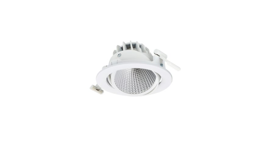 C/O D150mm, Aluminium, Blanc, Poudrage simple couche, Système Interact Ready de pilotes sans fil pour éclairage externe, 3000 lm, 33 W, 93 lm/W, Frost, 5000 K, (0.343, 0.331) SDCM <3, CRI>90, Faisceau semi-intensif, Aluminisé, Transparent, Verre, IP20 | Protection des doigts, IK02 | 0,2 J standard, Classe de sécurité II, 2 connecteurs à poussoir 2 pôles
